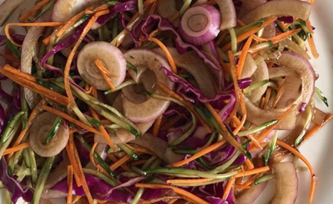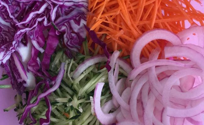 3、紫甘蓝,胡萝卜,黄瓜,洋葱都切丝。