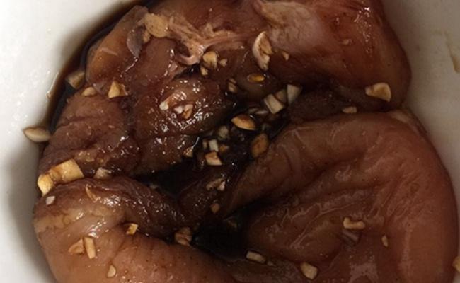 1、鸡胸脯肉从中间切开不要切断加红烧汁,蒜末,胡椒粉,适量盐腌制半个小时。