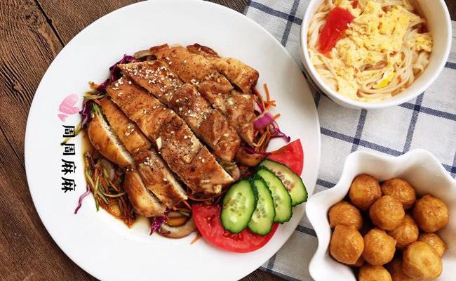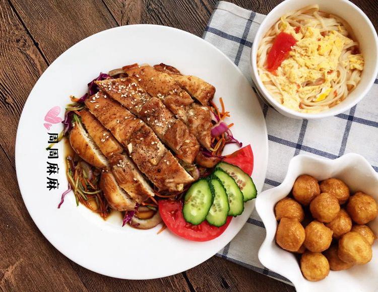 7、烤好的鸡肉切块放在蔬菜上挤上柠檬汁就可以了。