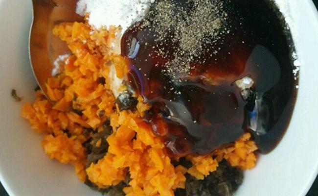 3、肉剁泥, 加入胡萝卜和木耳丁,放入淀粉,蚝油,生抽和胡椒粉,再滴入小半勺香油,一小把葱花搅拌均匀即可。