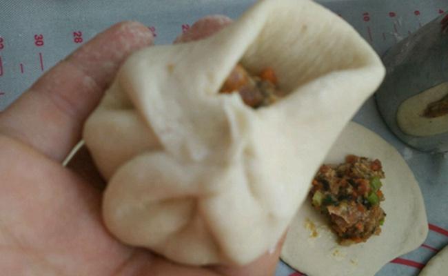 6、 放入一份肉馅, 以包包子的手法,捏褶子。