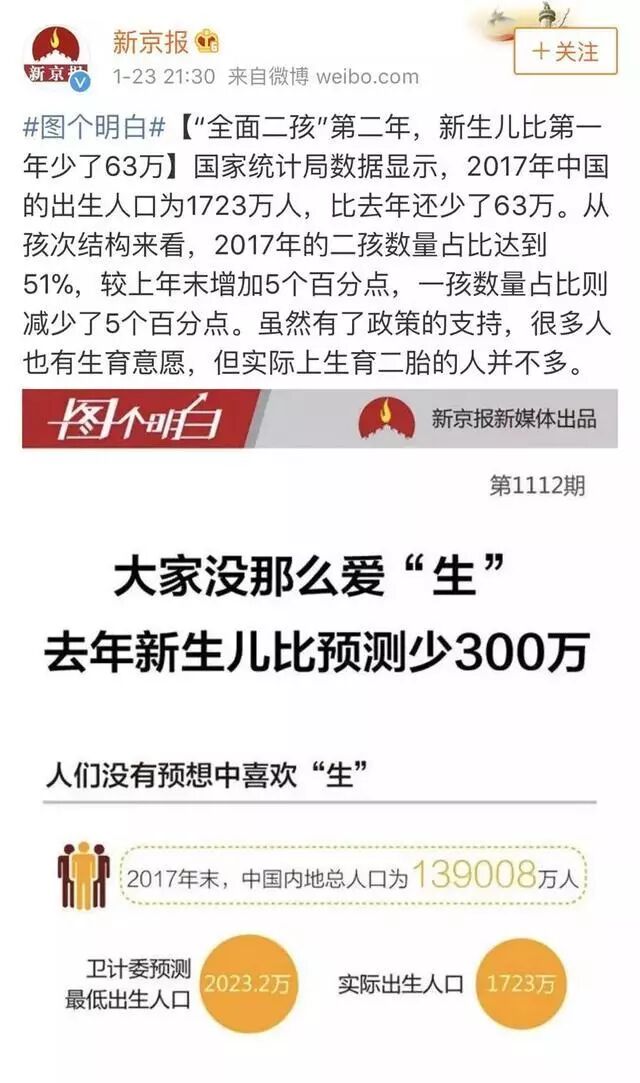 据国家统计局公布的数据显示,2017年,也是中国实行“全面二孩”政策的第二年,全年出生人口1723万人,比2016年减少了63万人,人口出生率同比下降了0.52‰,只有12.43‰。