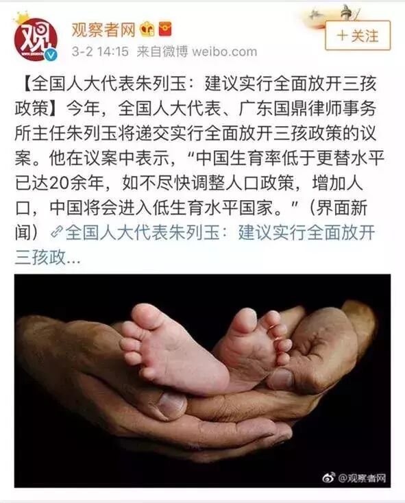 有大事,大事,事..... 全国人大代表朱列玉:建议实行全面开放三孩政策,今年将实现。护士君表示好久没遇到过这么振奋人心的消息了。前几天刷微博的时候不小心刷到这条微博,成功引起了护士君的注意。在怎么说护士君也是个热爱刷新闻谈国的文化人,那么今天让护士君跟大家分享一下,这国家到底是不是要开放三胎了,那么网友的反应又是如何?