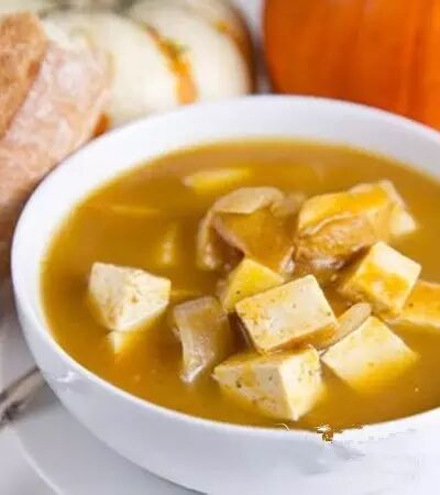 3.南瓜加入鸡汤、清水,入汤煲煮沸,转文火煲30分钟。
