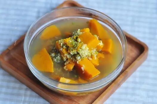 原料:老南瓜一斤、绿豆二两、盐适量。