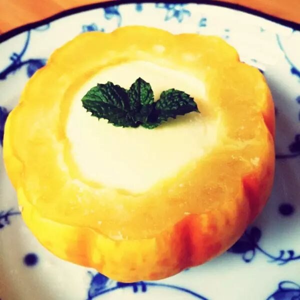 1.小南瓜洗净,沿顶部1/3处切开,顶部做盖子,余下部分掏出瓜瓤、瓜籽(用小汤匙沿内壁刮出南瓜蓉)后,入锅蒸至八、九分熟。