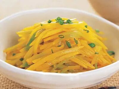 2.炒锅上火,放入菜油烧热后,倒入南瓜丝,用旺火速炒2~3分钟,撒上精盐、颠翻炒匀,放入葱花再颠翻两下,出锅即成。