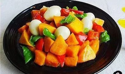 原料: 鹌鹑蛋10个、老南瓜200克、彩椒1只、生姜一块、花生油20克、盐8克、白糖3克、湿生粉少许。