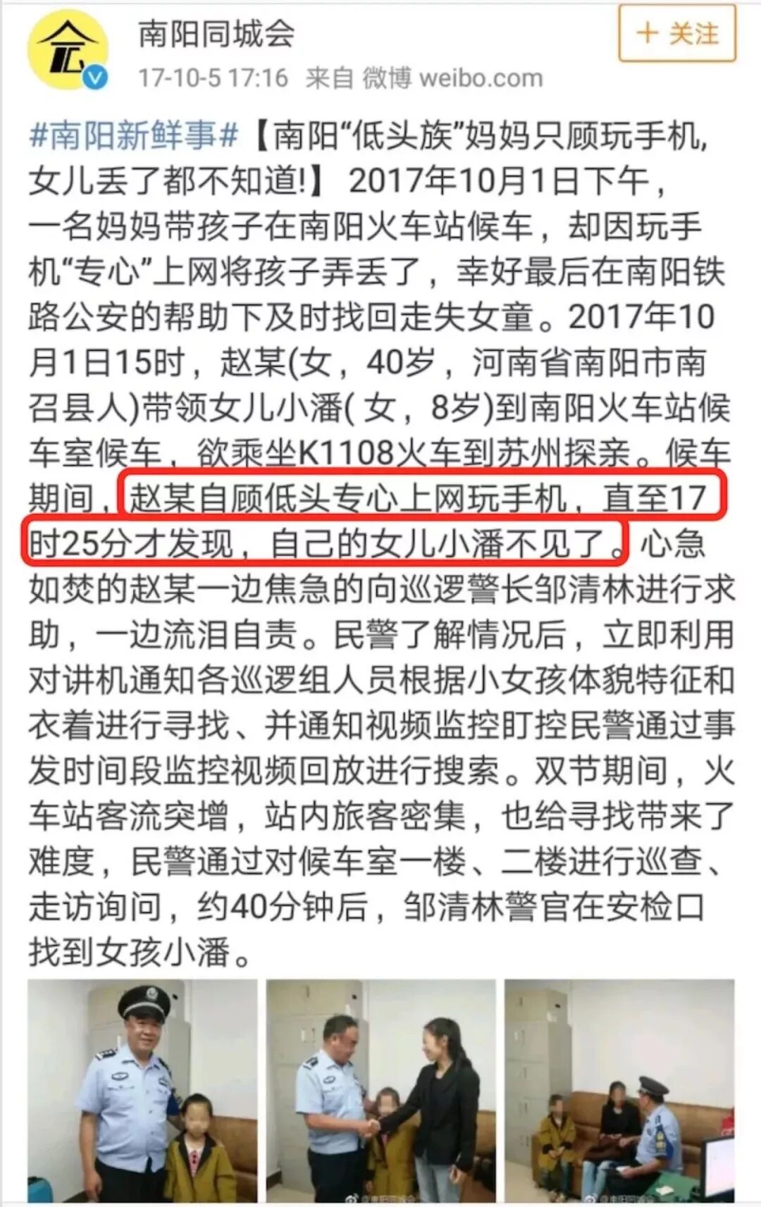 同年国庆节,南阳一位妈妈,带着女儿坐火车,在候车室只顾低头上网玩手机,8岁的女儿丢了近1个小时后才发现。