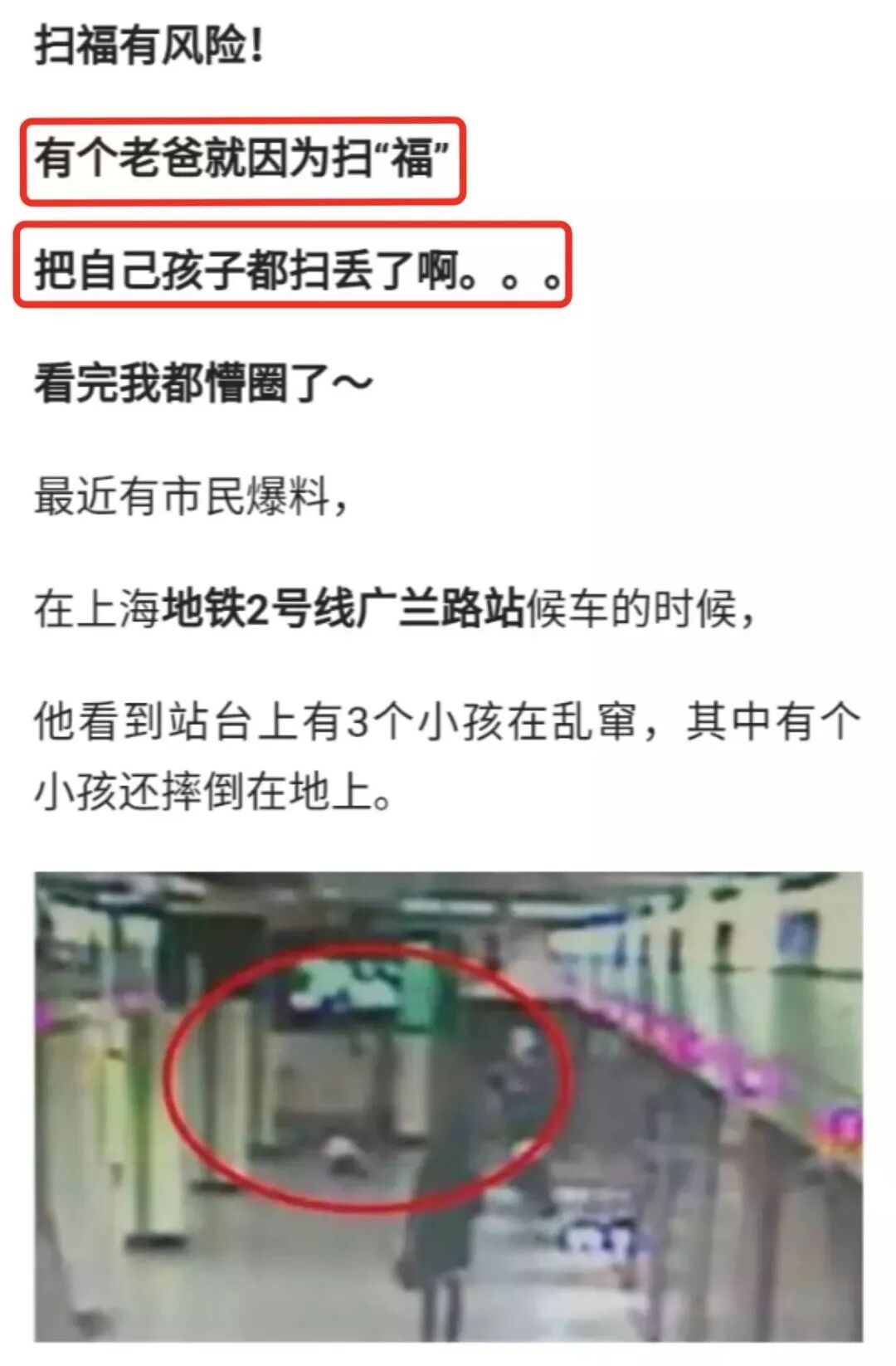 同年春节时,在上海某地铁站,一位爸爸因为忙着用手机扫福字,竟然把3个孩子都丢了。