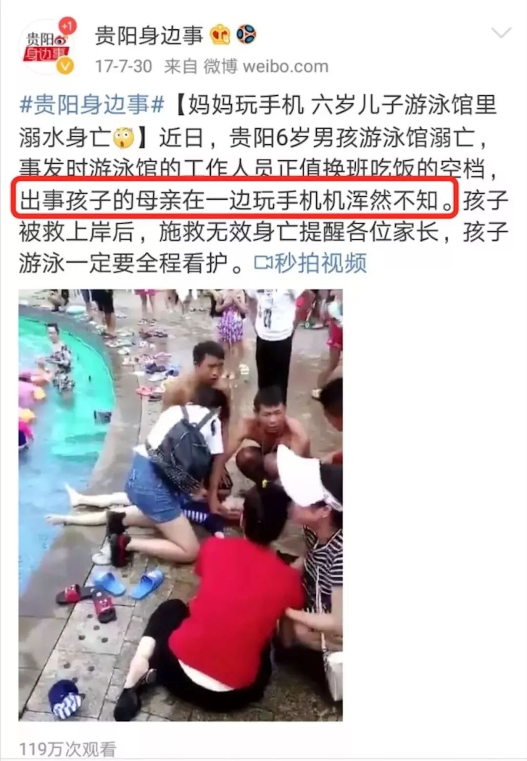 同样是在游泳馆,2017年的暑假,在贵阳,6岁男孩在游泳馆溺亡,出事时母亲一直在旁边玩手机,浑然不觉。