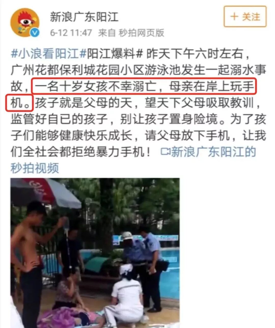 6月11日,广东阳江,一位10岁的小女孩在小区游泳池溺水身亡,事发时,妈妈正在岸上玩手机。