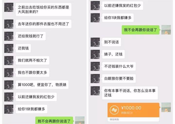 后来两人分手,男生问她要1000块分手费,不给就追着骂,“物质婊”,“见钱眼开”,“白眼狼”,不分白天黑夜地发信息。