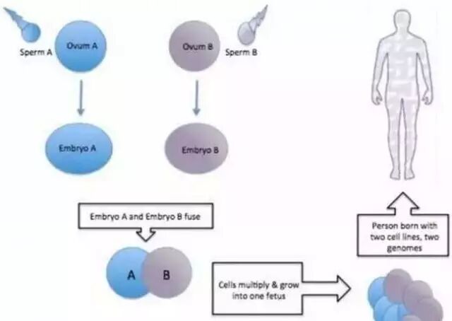 从本质上讲,嵌合体是由两种或者更多“个体”构成的一种生物体,它包含着两组DNA,其代码构成两种不同的生物体。嵌合体可自然出现在人类身体,胎儿可以吸收他的双胞胎。这种现象出现在异卵双生,如果一个胚胎在怀孕较早时期死亡,它的一些细胞会被他的孪生兄弟“吸收”。