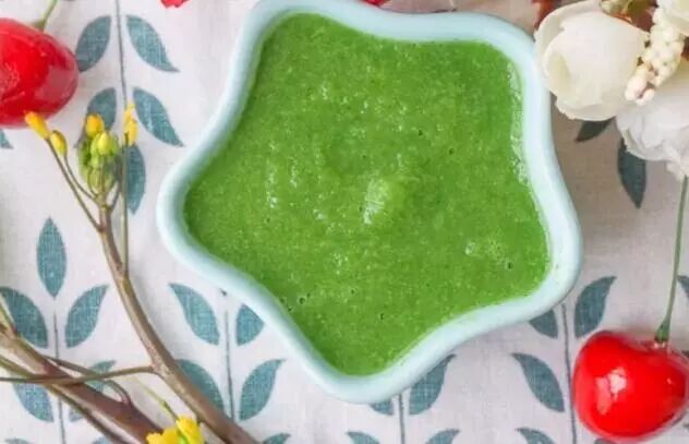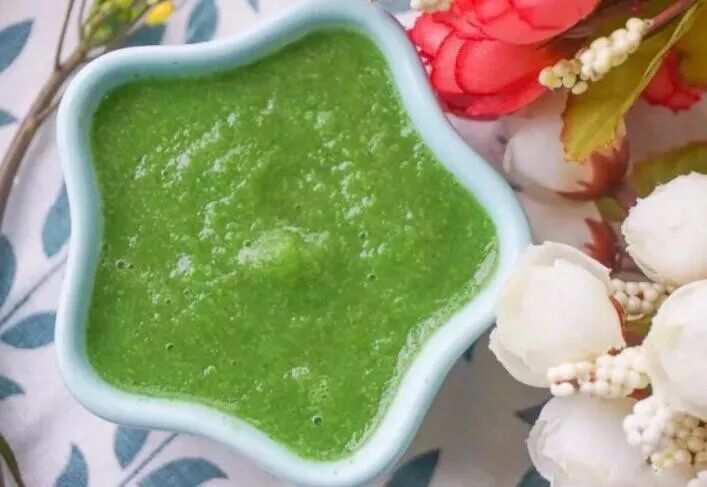 8、清甜的红菜苔泥出炉了,推荐搭配肉泥或高铁米粉一起食用;