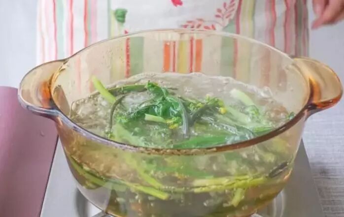 4、烧开水,将红菜苔放入沸水中焯熟。时间大约1分钟左右,蔬菜易熟,且有些营养不耐高温,不宜煮过久;