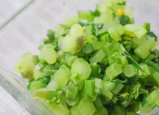 5、将焯熟的红菜苔捞起,晾温再切碎。先焯熟再切,可减少营养流失;如果是6~7个月没出牙或出牙少的宝宝,建议打成菜泥更合适;如果是8个月以上出牙多的宝宝,直接切碎吃,还可以让宝宝直接拿着整条菜苔当手指食物吃;
