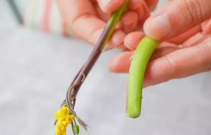 提示:如果是一两岁内的咀嚼能力弱的宝宝,我会建议要去一下皮,方便宝宝咀嚼,不然可能会出现嚼不烂、不好吞咽的现象;通常只要撕上半部分粗茎的部位,嫩尖就不撕;两三岁以上咀嚼能力好的宝宝和成人食用时,建议不去皮,选用较鲜嫩的红菜苔即可;