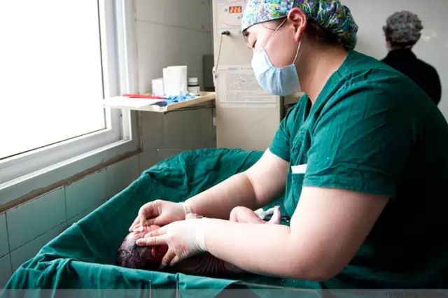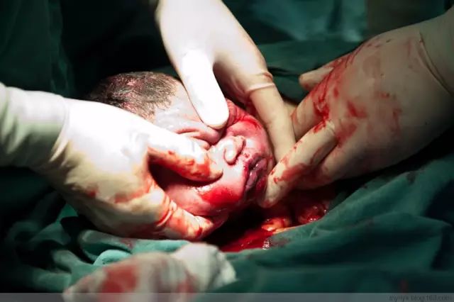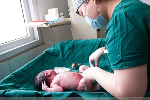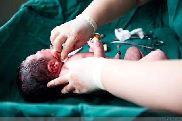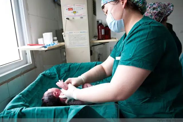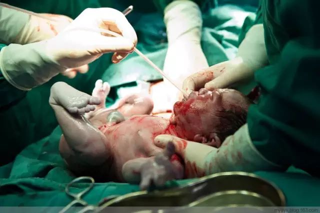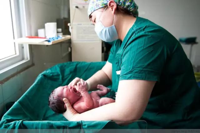 刚刚和母体分离,护士赶紧把孩子嘴里的羊水吸干净