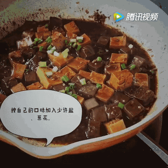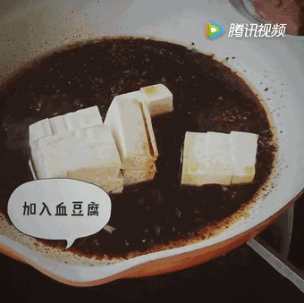 3、倒入猪血和豆腐,拌匀,盖上锅盖,小火煮5—8分钟。