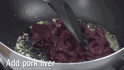 2、热油锅,爆香葱姜,倒入猪肝翻炒2分钟。
