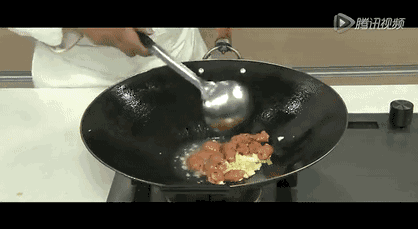 2、大肠入锅,中火煸炒一会,倒入豆瓣酱,继续炒1分钟。