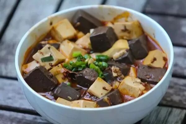 凝固的猪血、嫩豆腐、小葱、蒜、姜、红辣椒、花椒、酱油、盐