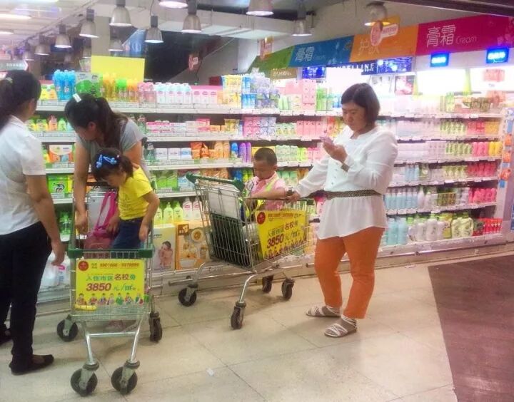 逛商场、超市时,很多家长常将购物车当作“儿童车”,把孩子放在购物车上推着走,甚至上下电梯也一样。