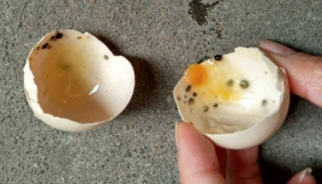 由于细菌侵入鸡蛋内大量繁殖,产生变质,蛋壳乌灰色,甚至使蛋壳因受内部硫化氢气体膨胀而破裂,而蛋内的混合物呈灰绿色或暗黄色,并带有恶臭味,此种蛋不能食用,否则会引起细菌性食物中毒。
