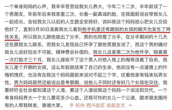 据女孩母亲所说,女儿与男朋友交往期间发现对方与其他女子有着不正当关系,两人分手后女儿发现怀孕了,因为男方令其打胎而想不开选择了自杀。