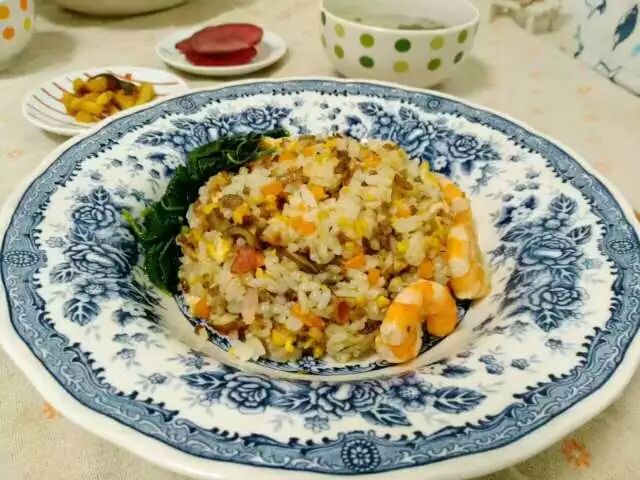 晚餐:海鲜蛋炒饭、萝卜片、裙带菜汤(维生素、蛋白质、脂质为主)