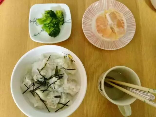 早餐:馄饨、西兰花、橘子(维生素、蛋白质为主)